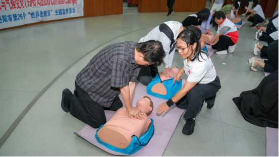 在培训操作现场,学员们分成小组,在老师的科学指导下进行心肺复苏、海姆立克急救法、止血包扎等技能的实操演练。同学们专注聆听、反复练习,将“纸上谈兵”转化为“敢出手、会出手”的应急能力,为守护生命增添一份从容底气。